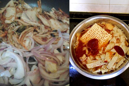 3、将适量的食用油倒入炒锅之中,油温烧热片刻后。把泡菜和洋葱放入炒锅之中,用铲子进行翻炒爆香。待其香味散发后,往里逐一加入些许的土豆、大酱、辣酱,大火煮上十分钟左右。
