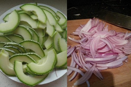 2、将角瓜、削去外皮的土豆浸泡在清水之中,清洗一遍后,放在砧板上,用刀切成片状。把洋葱剥去外皮,洗净后用刀切成细丝状,置于一边待用。
