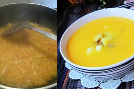 4、将新鲜的南瓜用刀削去外皮,用刀切成大块状。将适量的清水倒入蒸锅之中,将南瓜块放入蒸锅中,大火蒸上五六分钟。把蒸好的南瓜从蒸锅中取出,放入搅拌机中打烂成泥。