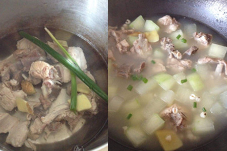 step4:排骨、姜同时下入锅中,随后加清水,先选择用大火烧开,再转用小火炖约1小时左右,然后加入事先准备好的冬瓜块,继续炖直至冬瓜块完全变透明。