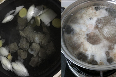 step1:对排骨进行处理。将其洗净后放入滚开的水中煮一下,随后去除浮沫,洗净,放置一侧备用。