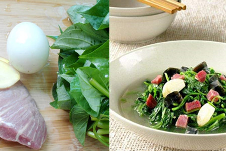 第三,锅里入油,下蒜片爆香后,将皮蛋丁下锅翻炒片刻,置入适量的高汤煮滚。汤汁儿沸腾时,把地瓜叶下锅,倾入少许火腿汁即可收锅。