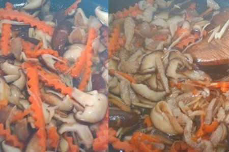 锅中继续倒油,将生姜大蒜切碎后倒入锅中翻炒,有香味了以后,将香菇和胡萝卜倒入锅中翻炒。香菇和胡萝卜炒制的时候要注意,要用大火,不然很难炒熟。等到胡萝卜炒软以后,就可以倒入炒好的肉丝了。加入适量的酱油和食盐,翻炒均匀后尝一下味道,咸淡适宜就可以出锅上桌了。