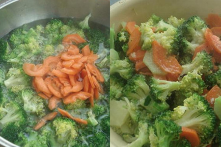 这个时候将西兰花和胡萝卜盛起来,放入沥水篮中沥干水分。准备一盘冷开水,将西兰花和胡萝卜倒入冷开水中冷却一下。完全冷透了再将它们捞出来沥干水分,放入盘子中摆好。