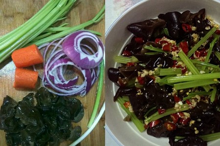 木耳提前三小时泡好,然后芹菜洗干净,把芹菜叶放在一边,然后根茎部位切段,胡萝卜剥皮切丝。蒜、干辣椒切好备用。用锅烧开水,把木耳、胡萝卜、芹菜焯一下水。然后全部放在一个碗里,把蒜、干辣椒、花椒、胡椒放在面上,烧热油淋在上面即可。口味偏咸的朋友可以倒入适量的酱油。你们赶紧动手做一下吧。