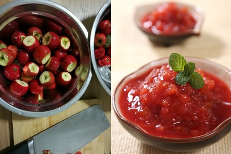 番茄酱大家一定不陌生,而且还经常吃,其酸甜的口感更是让不少的朋友爱上它,但其实山楂酱的口感和番茄酱也差不多,而且其营养价值还高于番茄酱。山楂酱的制作也十分的简单,手残的朋友都能做。把山楂洗干净,去掉根茎和籽,放入锅内加入适量的水不停地翻炒,到山楂十分软糯时就加入适量的红糖,然后继续炒制粘稠即可。酸甜的山楂酱就做好啦。
