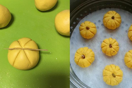 6、把醒发的南瓜面团放在案板上,用手揉成长条状。再用刀切成大小适当的面剂子,逐一把面剂子揉成小球状。用刮板在南瓜球上压出几道痕,在上面放在一个枸杞,这样可爱诱人的小南瓜就算制作完成了。