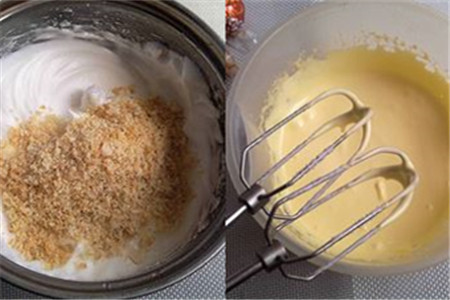随后我们再把蛋清加入柠檬汁,搅拌一会儿后,我们再往里面加糖继续搅拌,在一定时间后就可以了。这时候我们就可以把烤箱预热,用勺子把蛋白糊挖到蛋黄糊中搅拌,搅拌均匀后倒入模具中,再放进烤箱烤上二十分钟左右。然后我们把冰淇淋和蛋糕放在一起,用模具固定形状,放进冰箱中冷冻几个小时。我们再把外表修饰一下,我们的冰淇淋蛋糕就完成了。