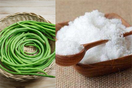 首先我们要准备一个密封的罐子,和几包盐巴,先把适当的盐巴放在罐子里,但是罐子也要用毛巾把水擦干净。盐巴放进去以后就把一半的豇豆放进去,尽量把豇豆理顺了再放,因为这样我们方便拿出来。豇豆放了再放一点盐巴花椒以及辣椒,这样泡出来的豇豆更好吃。