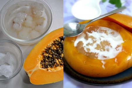 木瓜炖雪蛤是一道粤式甜品,经常吃能润肤养颜,而其做法也十分的简单。首先雪蛤要提前泡发到白色半透明状,注意泡的过程中要加入油和姜片去雪蛤的腥味。然后洗干净放入开水中煮半小时。木瓜横切一小半后去籽,倒入纯牛奶放入锅里隔水蒸十五分钟。把煮好的雪蛤放进蒸好的木瓜牛奶中,隔水再蒸十分钟即可,喜欢吃甜味的朋友可以在蒸的时候放冰糖。