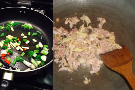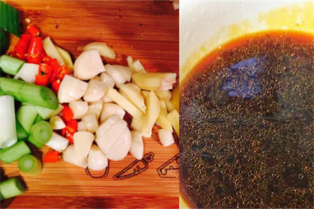在腌制鸡胸肉的同时,我们将葱姜蒜切成小段,放在一个碗里。然后就可以开始宫保鸡丁酱汁的调制了,酱汁的调制可以按照自己的的口味决定每种调料添加的多少,我们一般加入醋、料酒、淀粉、老抽、糖、味精、盐调制而成,如果觉得酱汁太浓了,也可以加入适量的水。