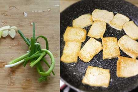 4、将适量的食用油倒入锅中,油温烧热后,把豆腐片轻轻地下入油锅中。煎至一面金黄后,用铲子翻面继续煎至金黄,便可把煎好的豆腐盛出待用。煎制豆腐的时候,一定要小火慢慢煎,以免煎糊。