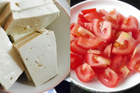 1、准备的食材有老豆腐、西红柿、松子。