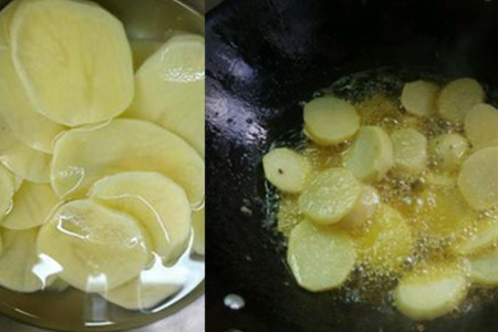 6、土豆片炸熟后,用漏勺捞出待用。油温再次升高后,把土豆片复炸一遍,这样做出来的土豆片更加色泽金黄。把炸好的土豆片用捞出,控干上面多余的油分,置于一边待用。
