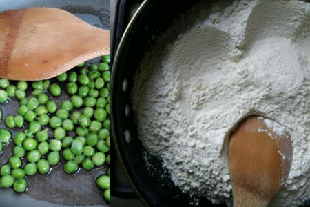 5、将适当的食用油倒入炒锅中,油温烧热片刻后。往油锅中加入蒜末、葱花进行翻炒爆香。待其香味开始散发后,把豌豆加入锅中炒制两三分钟,便可盛盘待用。利用锅中剩余的食用油,把面粉倒入锅中小火进行翻炒,面粉炒至微微发黄后。