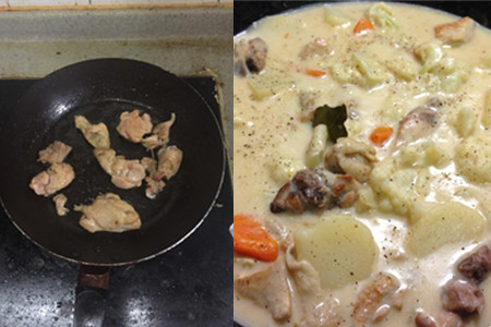 7、另取一锅,往锅中倒入些许的食用油,油温烧热片刻后。把鸡肉轻轻地下入油锅中,煎至两面呈现金黄的色泽。这时候便可把米酒倒入其中,再往锅中逐一加入土豆、蘑菇、洋葱、胡萝卜进行混合翻炒。