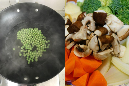 3、把西兰花用刀削去根部不能食用的部分,用手掰成小块,放在清水中清洗干净。将足量的清水倒入煮锅之中,下入些盐、滴上几滴食用油。大火水烧开后,把洗净的豌豆全部加入煮锅中。豌豆煮熟后,把西兰花放入水中焯煮片刻,便可用漏勺将其捞出,放在凉水中冲一遍水。
