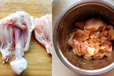2、先将买回来的鸡腿洗净表的血沫,剔除其中的大骨和比较肥的部位。把它摆在砧板上,用刀切成大块状。在一个碗中打入一个鸡蛋,用蛋清分离器取出蛋黄,仅仅留下蛋清。往鸡腿肉中逐一加入些许的盐、黑胡椒、蛋清进行均匀地抓捏,放在一边腌制半个钟头上下。