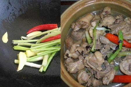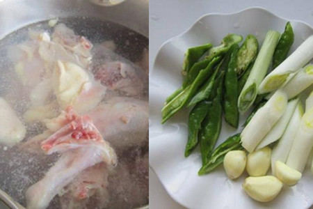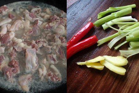 鸭肉洗干净,凉水下锅,煮掉血沫和腥味,捞起用凉水冲洗干净。芹菜洗净切成长段,生姜去掉外皮切片,辣椒洗净去蒂。