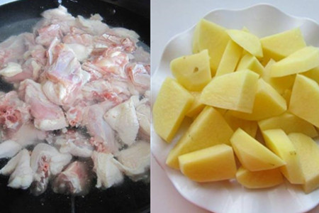 鸭子清洗干净,斩成小块。取一口煮锅,煮锅加入适量水,鸭块凉水下锅,开大火煮开后捞起滤干。葱姜洗净分别切成小段和片,大蒜剥掉蒜衣,土豆削掉外皮切小块,干辣椒用清水泡一下,青辣椒洗净切成小块。