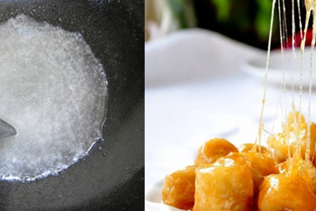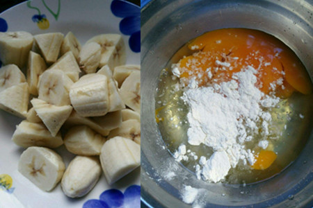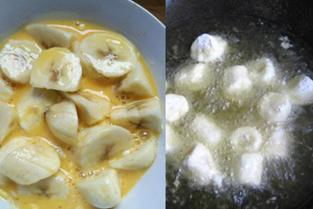 准备鸡蛋,蛋清分离后加入少量的面粉调成糊状,然后锅内倒入适量的食用油,等待油热后,把香蕉块裹上面糊放进去。因为香蕉遇热后会变得非常软,所以我们不要触碰它,等待炸至成形后捞出来就可以。然后再炸一次,颜色变成金黄色再拿出来。锅里留少量油,加入白糖熬化,注意火候,要一直搅拌,不要把白糖炒糊了。