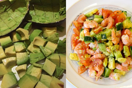 首先将虾仁洗干净,再用热水煮熟。在煮的时候,往水中加入一点食盐。煮熟之后,将其捞出来放入碗中备用。随后,将番茄、黄瓜以及牛油果洗干净,并切成丁状。然后,将它们全都倒入盛放着虾仁的碗中,再撒上盐以及黑胡椒,用勺子将其搅拌均匀就可以食用了。