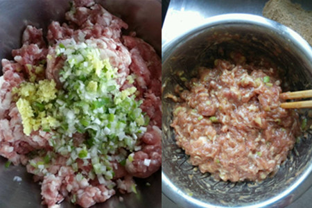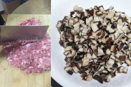 3、先将买回来的新鲜的猪肉洗净表面的血水,洗净后控干多余的水分。将其放在砧板之上,用刀剁成碎末状。往肉馅之中逐一加入些许的料酒、盐、生抽、香油、淀粉、胡椒粉、香菇末、胡椒粉、葱姜末进行均匀地搅拌,放在一边腌制十分钟左右。
