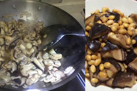 4、将些许的食用油下入炒锅之中,油温烧热到七八成时。把香菇块下入锅中进行反复煸炒,香菇开始变色后。往锅中倒入熟黄豆,往里加入少量的清水。盖上盖子,汤汁烧开后。逐一往锅中淋入酱油、撒上白糖进行调味。盖上盖子进行炖煮十分钟上下,煮至香菇完全熟透,撒上些盐便可盛盘食用。