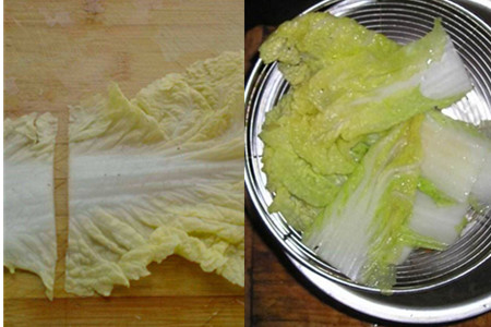 5、白菜切去菜帮子,仅仅留下软叶子。白菜叶和香菜一起放在清水中,清洗干净其中的泥沙和杂质。洗净后控干多余的水分,放在一边待用。