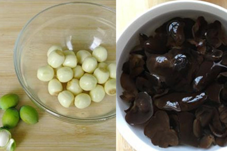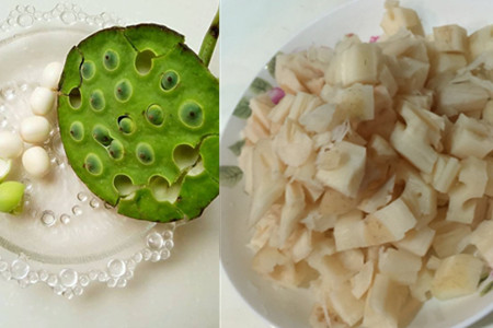 2、先将莲子从莲蓬之中剥出来,把新鲜的莲子剥去青皮,洗净后放在一边待用。把新鲜的莲藕用刷子刷净根茎部的泥沙,洗净表面的杂质,控干多余的水分。用刀切成小丁状,置于一旁备用。