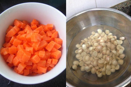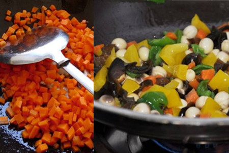 6、将适当的食用油倒入炒锅中,油温烧热到七八成时。把胡萝卜丁加入油锅中,用铲子进行翻炒爆香。胡萝卜开始变色后,再逐一往锅中加入黑木耳、黄椒、青椒、莲子,因为胡萝卜比较难熟,所以一定要先把胡萝卜放入锅中煸炒。