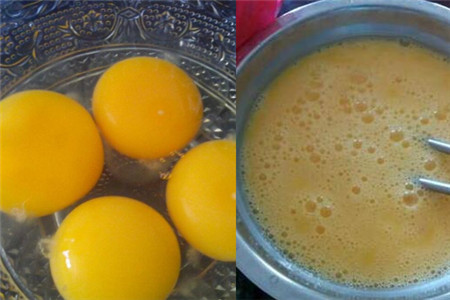然后放几个鸡蛋,不用把蛋黄和蛋清分开,直接将鸡蛋磕开之后放入盆子里面,然后将它们搅拌均匀,其实还是尽量准备一个鸡蛋搅拌器,因为如果用筷子的话十分的不方便,而且不能够将鸡蛋打散。如果家里面没有鸡蛋搅拌器,就多拿几只筷子搅拌。