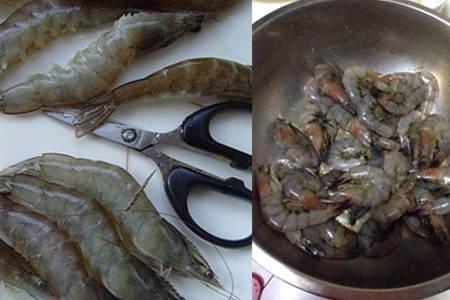 2、先将买回来的新鲜的虾子用剪刀剪去根须和虾枪,剔除掉其中的虾线往虾子中逐一加入些许的盐、淀粉、料酒进行充分地抓捏,放在一边腌制二三十分钟左右,使鲜虾更加均匀入味。