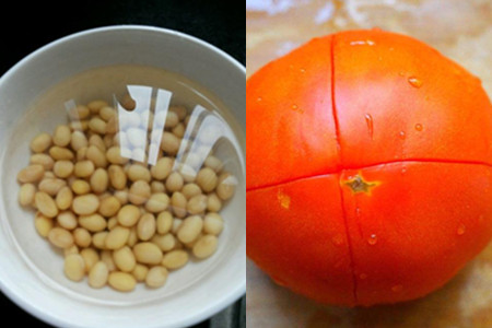 5、生姜剁成碎末。将适量的食用油倒入炒锅中,油温加热片刻后。把生姜末放入油锅中进行煸炒爆香,待生姜味开始散发后,把番茄丁放入其中炒软。这时候把泡发好的黄豆加入锅中进行翻炒,再往锅中倒入准备好的高汤。
