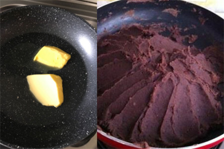 然后,下一步也是很重要的,在锅里放入适量的色拉油,当油热的时候,再加入适量的糖,直到糖融化了之后,加入少许的水,将水烧开了之后,加入刚才煮好的红豆,这里就需要大家不停的去进行搅拌,防止豆沙粘在锅里,然后一直进行翻炒。等炒干了之后就可以出锅了。