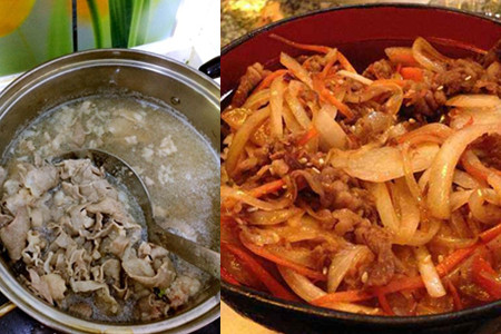 7、再往炒锅中下入烫好的肥牛,撒上些盐进行调味,翻炒均匀后把它盛在热呼呼的米饭上,便可出锅食用了。