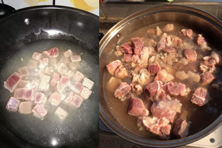 2、先将买回来的新鲜的牛肉洗净表面的血水,用刀切成小块状,放在一边待用。将适当的清水倒入煮锅之中,把牛肉和洗净的花椒全部下入水中,大火煮至牛肉析出血沫,汤汁沸腾后。用漏勺捞出,用准备好的温水冲洗表面的浮沫。