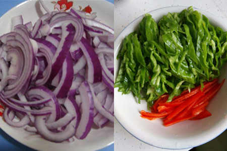 2、先将洋葱剥除掉表皮,冲洗干净后切成丝状,放在一边待用。西红柿择净根蒂,浸泡在清水中,撒上些盐。浸泡大概十分钟左右,浸泡好后放在清水中冲洗一遍。把洗净的西红柿控干水分,放在砧板之上,用刀切成长条状。