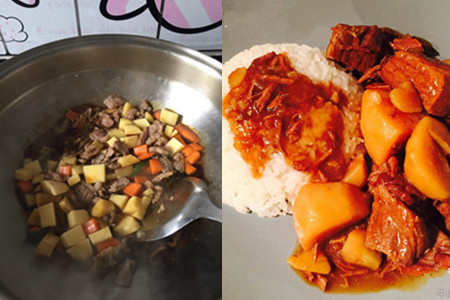 6、再往锅中逐一加入些许的番茄酱、蚝油、甜辣酱、盐、生抽进行调味,往锅中倒入之前炖牛肉的汤汁,汤汁尽量要没过食材。大火烧开沸腾后,改为中火继续炖煮五六分钟。在一个碗中加入面粉,下入些许的清水进行搅拌均匀。