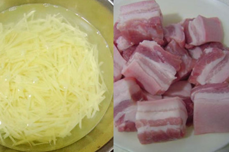 2、先将土豆削去外皮,洗净后用刀切成细丝状。把土豆丝放在清水中浸泡,以析出其中的淀粉。新鲜的五花肉放在水龙头下,冲洗干净表面的血水,沥干上面的水分,用刀切成小块状。