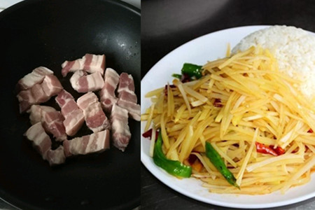 4、把适当的花生油下入炒锅中,油温稍微加热片刻后。把五花肉下入油锅之中,用铲子进行翻炒出油。这时候再把葱花下入一起翻炒,把切好的土豆丝加入炒锅中进行煸炒。淋上些醋,加上些盐、适当的清水,翻炒均匀后便可关火。把制作好的土豆丝放在米饭上,便可食用了。