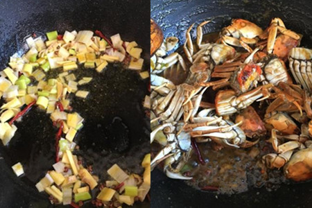 炒锅放油烧热,或者用炸螃蟹的油,下花椒粒、麻椒和辣椒炸香,再加入葱姜煸炒。葱姜炒出香味之后,将炸好的螃蟹下锅,快速翻炒几下,再兑入调好的料汁,继续翻炒,直至每块螃蟹都入味就可以出锅了。