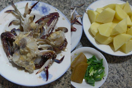 食材:大闸蟹300克、土豆200克、咖喱块2块、葱段、生抽、食盐、油。