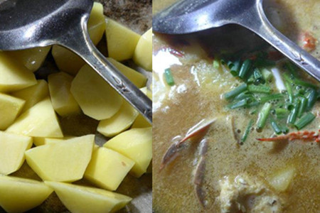大闸蟹清洗干净,去掉蟹壳、蟹腮和蟹胃,用刀对半切开。土豆削掉外皮,切成大小合适的块状,咖喱块和葱段准备好。
