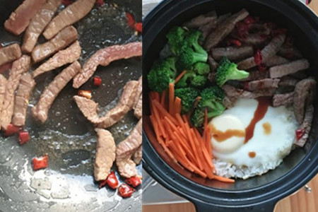 炒锅内放适量油烧热,下腌制入味的牛肉条爆炒,炒至六七成熟待用。准备一个小碗,碗里加入适量白糖、蚝油和生抽,搅拌均匀至白砂糖融化。米饭上鸡蛋焖熟之后,把炒好的牛肉条、焯过水的西兰花和胡萝卜丝码在米饭上,浇上调好的味汁,加盖继续焖煮三分钟即可关火,关火之后,先不要揭盖,再焖三分钟才能开盖,开盖后搅匀即可开吃。