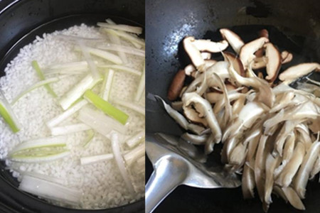 大米浸泡好之后,将葱白铺在它的上面,开中火煮。与此同时,炒锅放入适量食用油烧热,下干香菇条煸炒。干香菇炒香之后,将其他菌菇一起下锅,翻炒至五成熟,盛出备用。再向炒锅里加少许油烧热,下腌好的鸡腿肉丁煸炒,炒至半熟状态待用。