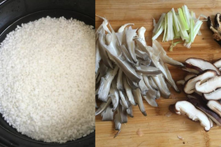 大米清洗干净,滤干水分,装入砂锅中,兑入分量为大米1.2倍的清水,浸泡二十分钟左右。大葱洗净切成细长条,平菇清洗干净掰成小条,鲜香菇洗净切成片状,泡发好的干香菇也切条。
