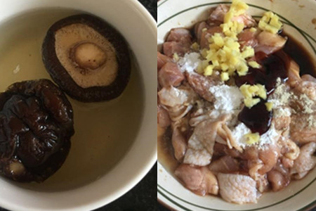 食材:鸡腿肉100克、鲜香菇40克、干香菇5克、平菇40克、大米150克、大葱、土豆淀粉、香油、生抽、料酒、蚝油、白胡椒粉、姜末。干香菇提前泡发。鸡腿洗净去掉骨头,鸡腿肉切成丁状,装入碗中,加入适量蚝油、料酒、生抽、白胡椒粉、土豆淀粉和姜末,用手揉捏均匀,腌制半小时。