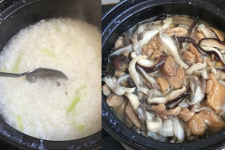 砂锅里的水分煮至半干并且米粒露出水面时,用汤勺搅一搅,防止糊锅,接着将炒过的鸡腿肉和菌菇码在米饭上,加盖,调至小火焖五分钟。五分钟后,开盖,沿着锅边淋一圈香油,加盖,调至中火焖煮。待闻到锅巴香味时,改成小火焖一分钟即可关火。关火之后,不要立刻打开盖子,继续焖五分钟再打开。