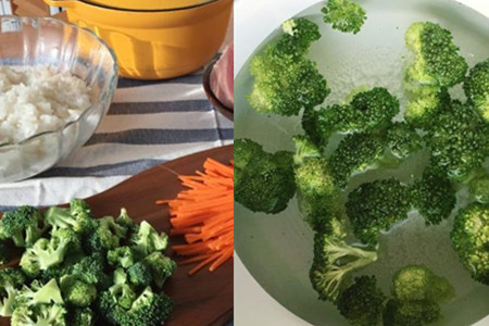 西兰花洗净掰朵,胡萝卜洗净切成细丝,大米洗净用清水浸泡。锅内倒入清水烧开,加入适量食盐和香油,下西兰花烫熟捞起滤干。